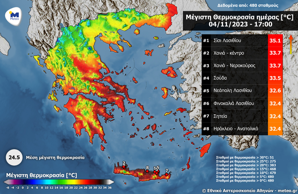 Όσων αφορά στις μέγιστες θερμοκρασίες, η γεωγραφική κατανομή των οποίων αποτυπώνεται στον χάρτη που ακολουθεί, 51 μετεωρολογικοί σταθμοί κατέγραψαν μέγιστες άνω των 30 βαθμών. Η μεγαλύτερη εξ αυτών σημειώθηκε στο Σίσι Λασιθίου, όπου οι 35,1 βαθμοί που καταγράφηκαν αποτελούν Πανευρωπαϊκό Ρεκόρ Νοεμβρίου.