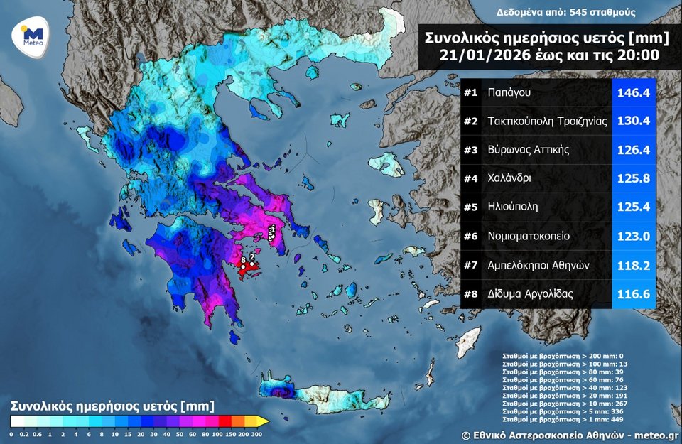 Παρακάτω ακολουθεί ο συνολικός ημερήσιος υετός από τους αυτόματους μετεωρολογικούς σταθμούς του δικτύου του Εθνικού Αστεροσκοπείου Αθηνών/Meteo.gr μέχρι και τις 20:00 ώρα Ελλάδας της Τετάρτης.