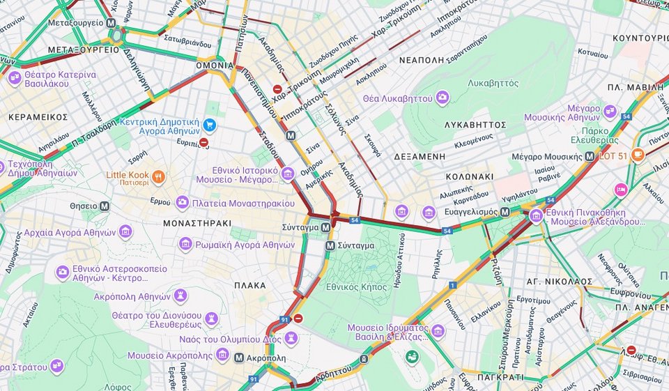 Προβλήματα παρατηρούνται και στους δρόμους στο κέντρο της πρωτεύουσας, όπως μαρτυρά ο παρακάτω χάρτης του Google Maps.
