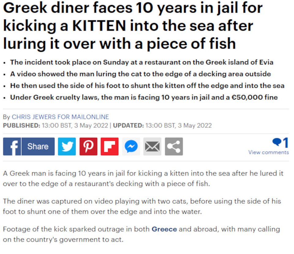 Το ρεπορτάζ έχει τίτλο «Έλληνας πελάτης εστιατορίου αντιμετωπίζει 10ετή κάθειρξη επειδή κλώτσησε γατάκι στη θάλασσα, αφού το προσέλκυσε με μια μπουκιά ψαριού».