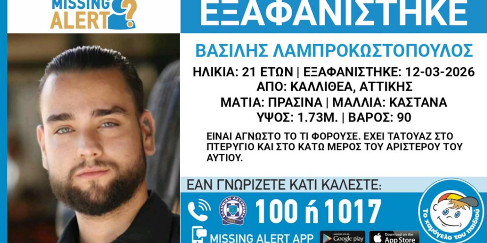 Συναγερμός στην Καλλιθέα για την εξαφάνιση του Βασίλη Λαμπροκωστόπουλου, ηλικίας 21 ετών.