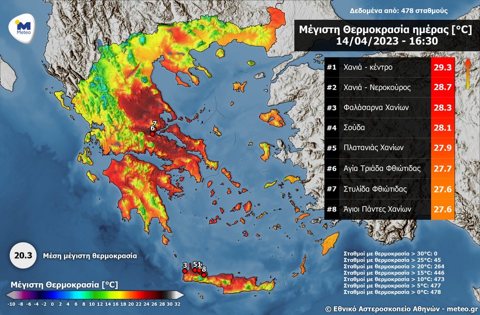 Στον σχετικό χάρτη παρουσιάζεται η μέγιστη θερμοκρασία στη χώρα, καθώς και οι 8 σταθμοί του Meteo που κατέγραψαν τις υψηλότερες μέγιστες το μεσημέρι της Μεγάλης Παρασκευής 14 Απριλίου. Στον ίδιο χάρτη αναγράφονται και άλλες πληροφορίες, όπως για παράδειγμα το γεγονός ότι ο υδράργυρος ξεπέρασε τους 25 βαθμούς Κελσίου σε 45 σταθμούς του δικτύου.