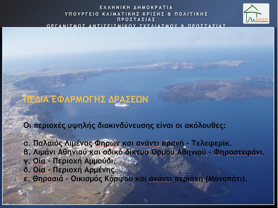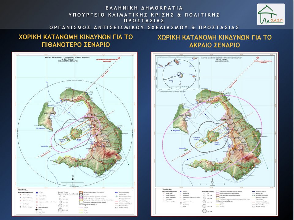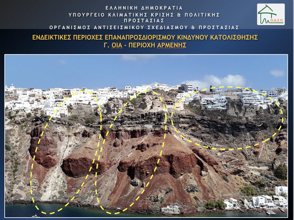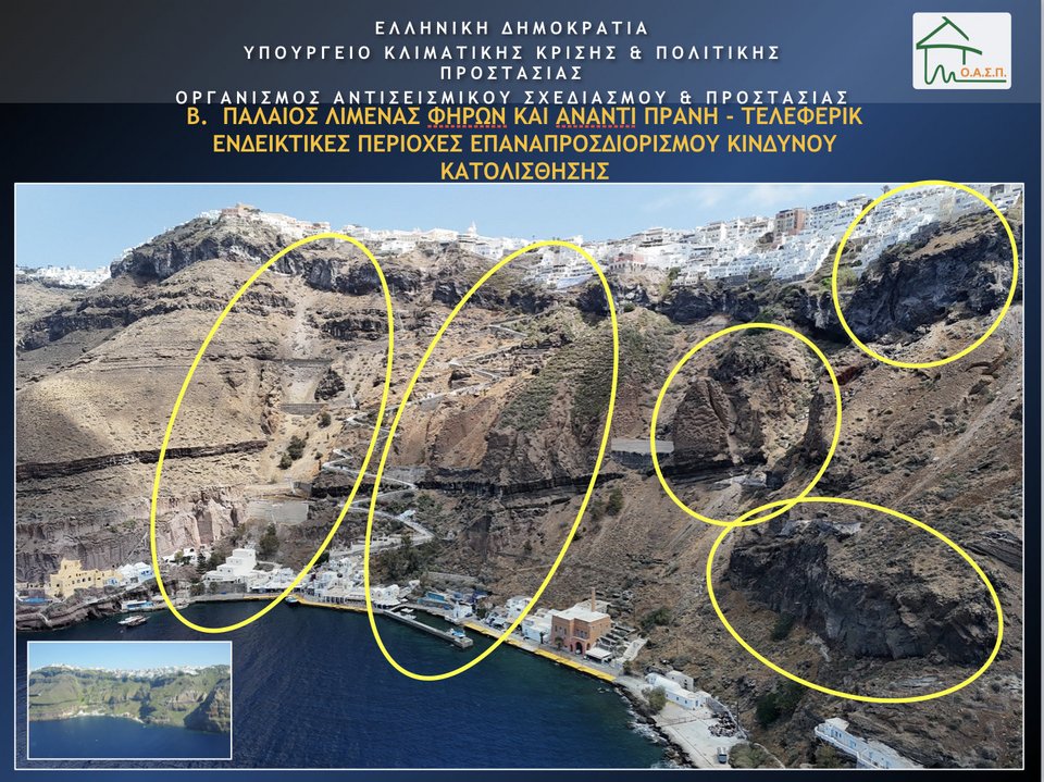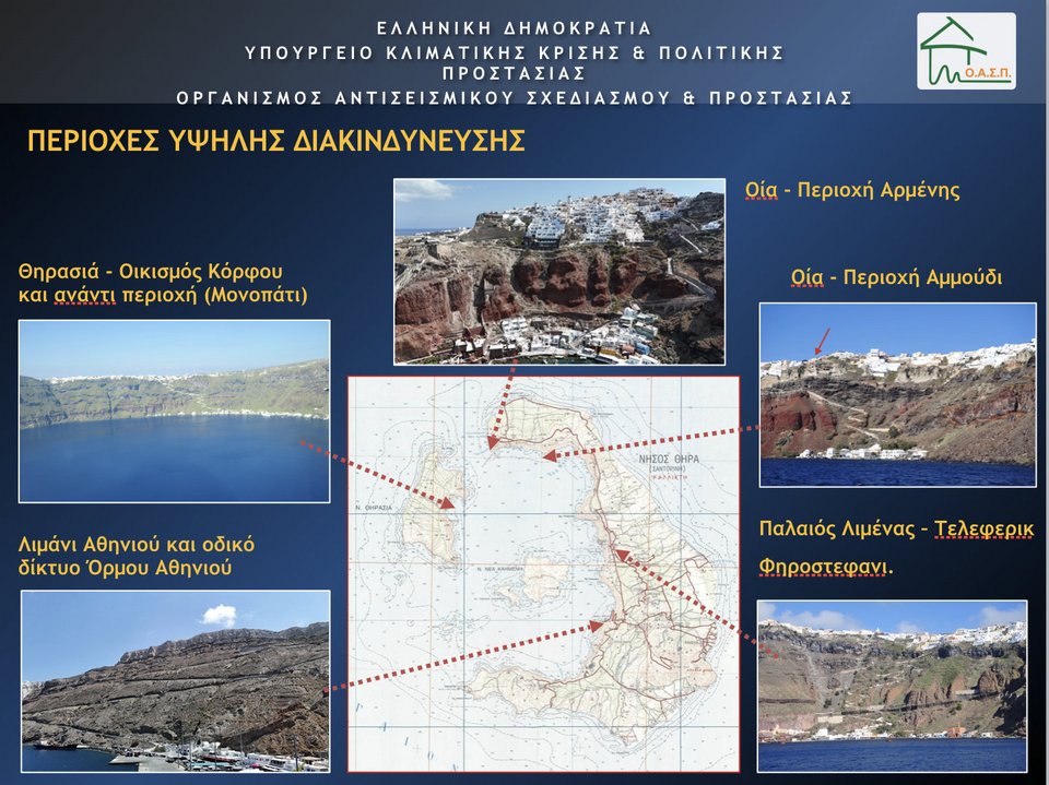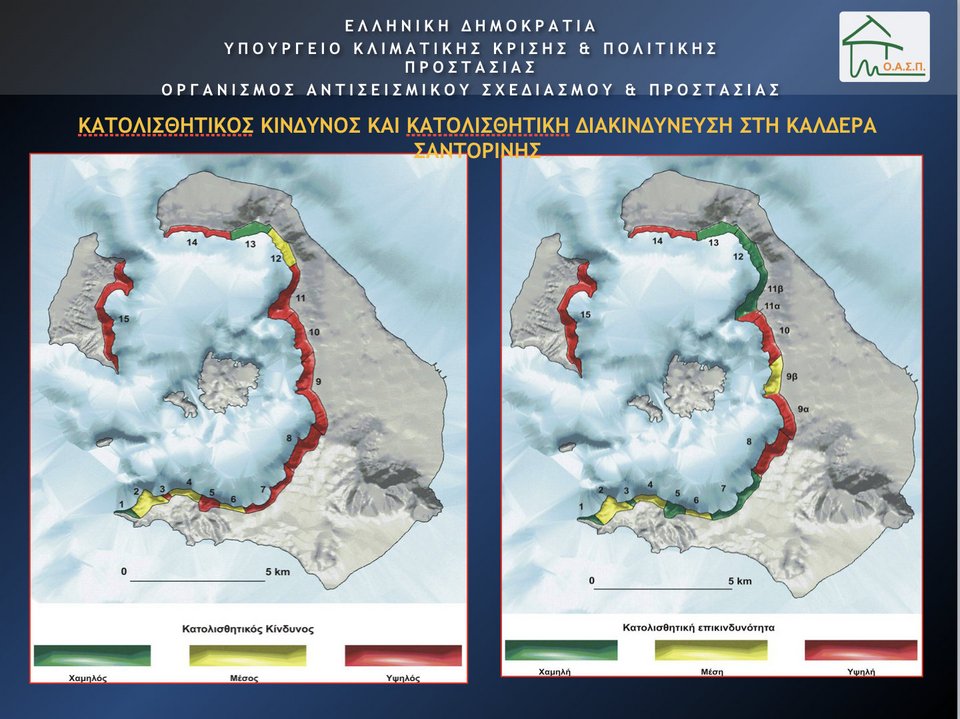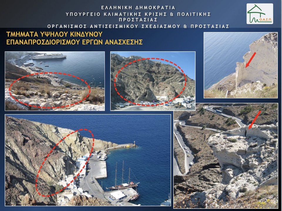 Η Σαντορίνη, λοιπόν, διαμορφώθηκε από αυτούς τους γεωδυναμικούς κινδύνους και κυρίαρχα από τον ηφαιστειακό κίνδυνο, τον σεισμικό κίνδυνο, τον κατολισθητικό κίνδυνο. Αυτοί οι κίνδυνοι λοιπόν, δημιούργησαν και το μοναδικό ηφαιστειακό σύμπλεγμα της Σαντορίνης. Είναι επόμενο αυτοί οι κίνδυνοι να εκδηλώνονται κατά περιόδους και βεβαίως θα ασχοληθούμε στη συγκεκριμένη περίπτωση με τον κατολισθητικό κίνδυνο, ο οποίος είναι ένας κίνδυνος που διαμορφώνει συνεχώς τα μοναδικά πρανή της καλντέρας. Ο κίνδυνος, λοιπόν, σε όλο το μήκος σχεδόν των πρανών της καλντέρας της Σαντορίνης είναι υψηλός, αλλά και η διακινδύνευση είναι υψηλή, δεδομένου ότι σε αυτά τα σημεία συγκεντρώνεται πλήθος κόσμου τουλάχιστον οκτώ μήνες κάθε χρόνο», ανέφερε ο κ. Λέκκας.