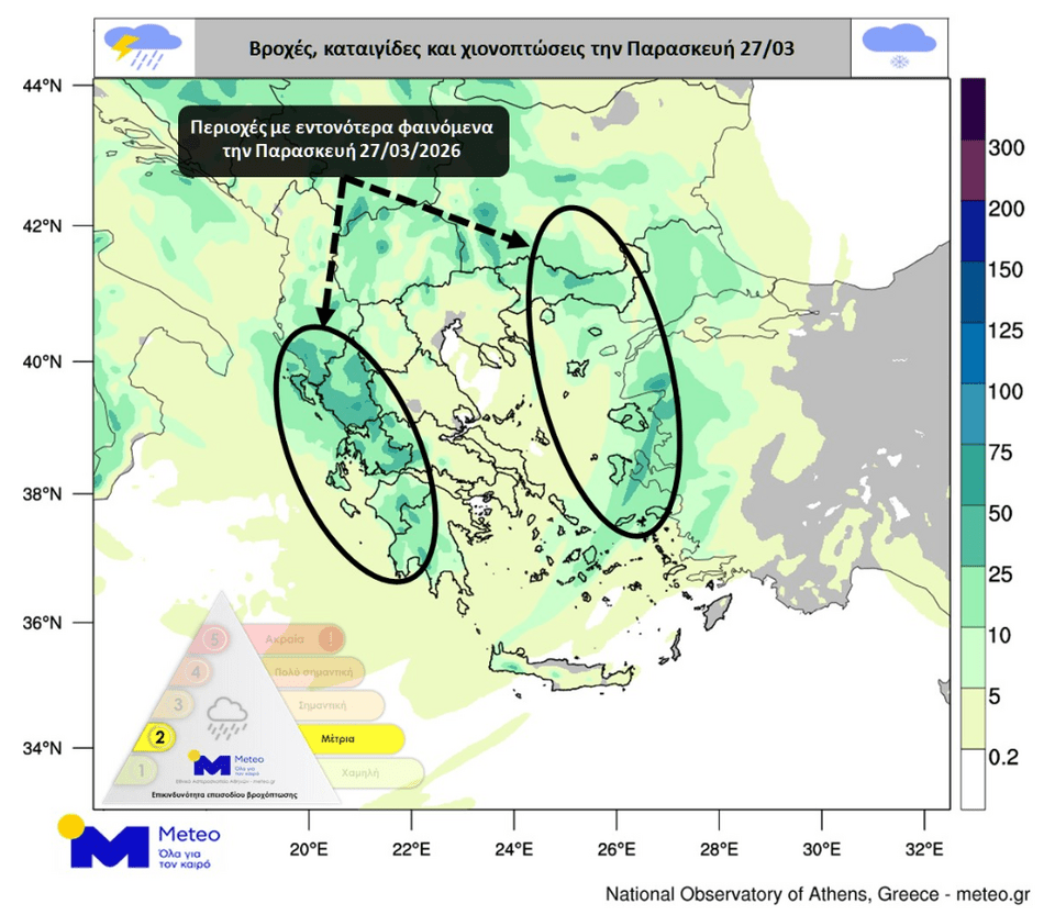 Στον προγνωστικό χάρτη παρουσιάζεται ο αθροιστικός υετός (βροχοπτώσεις/χιονοπτώσεις) που αναμένονται κατά τη διάρκεια της Παρασκευής 27/03.