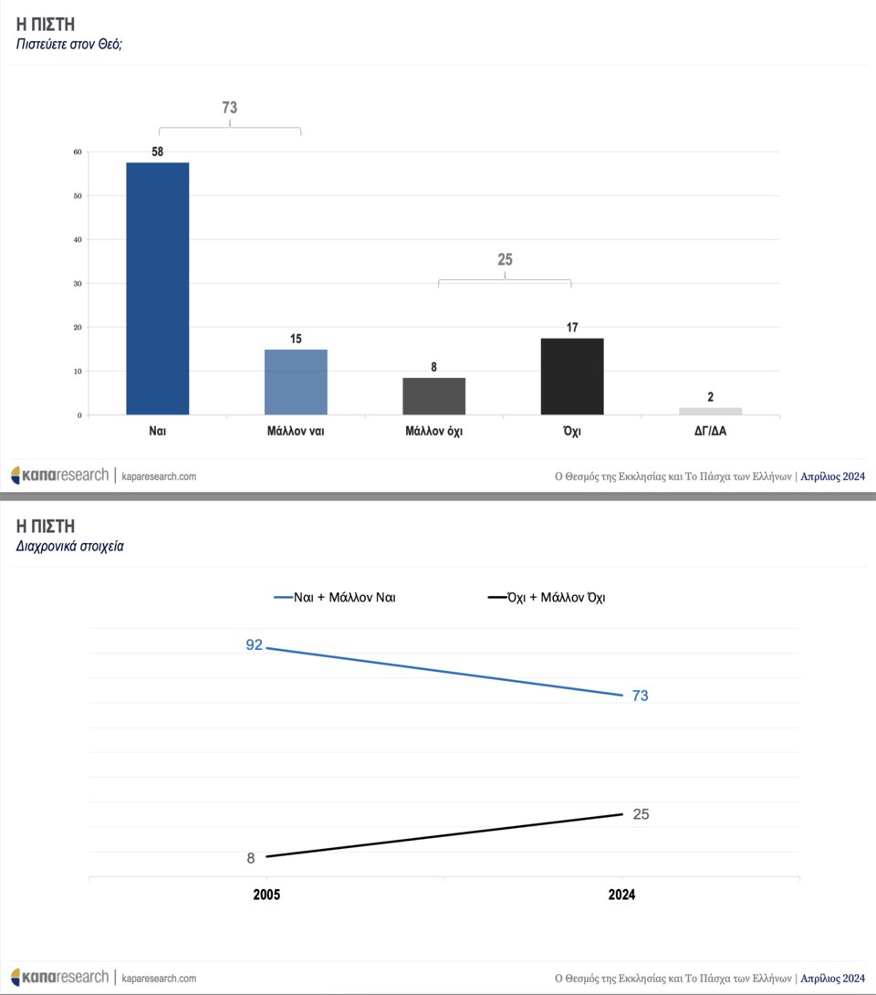 - Αναμφίβολα οι εμπειρίες της 20ετίας – η έκρηξη της τεχνολογίας, η οικονομική κρίση, η πανδημία, οι πολεμικές συγκρούσεις – έχουν θέσει την πίστη υπό δοκιμασία: 73% των ερωτώμενων δηλώνουν ότι πιστεύουν στον Θεό από 92% το 2005. Υπό αυτό το πρίσμα, για το 73%, η πίστη δεν έχει διαρκώς το βλέμμα στραμμένο στην αιωνιότητα, αλλά αναζητά την εφαρμογή της στη ζωή.