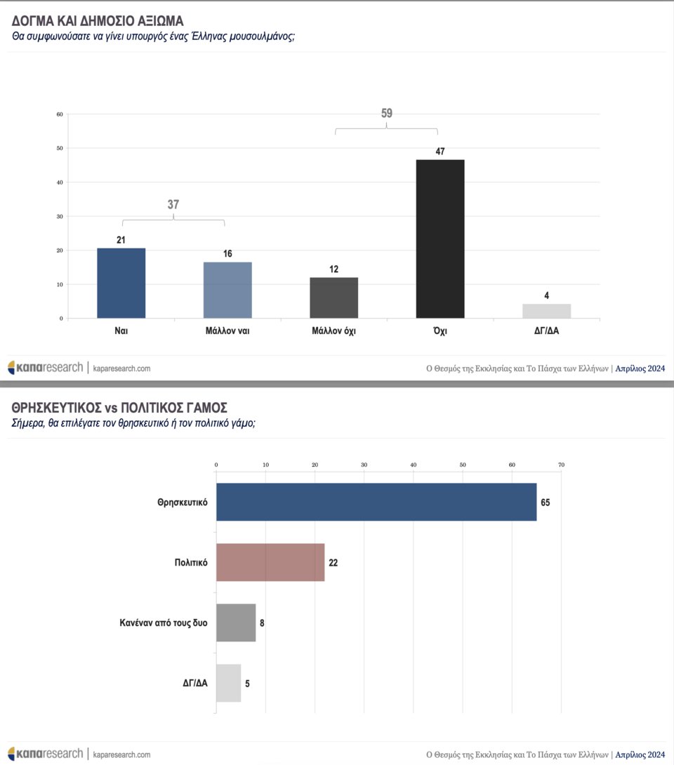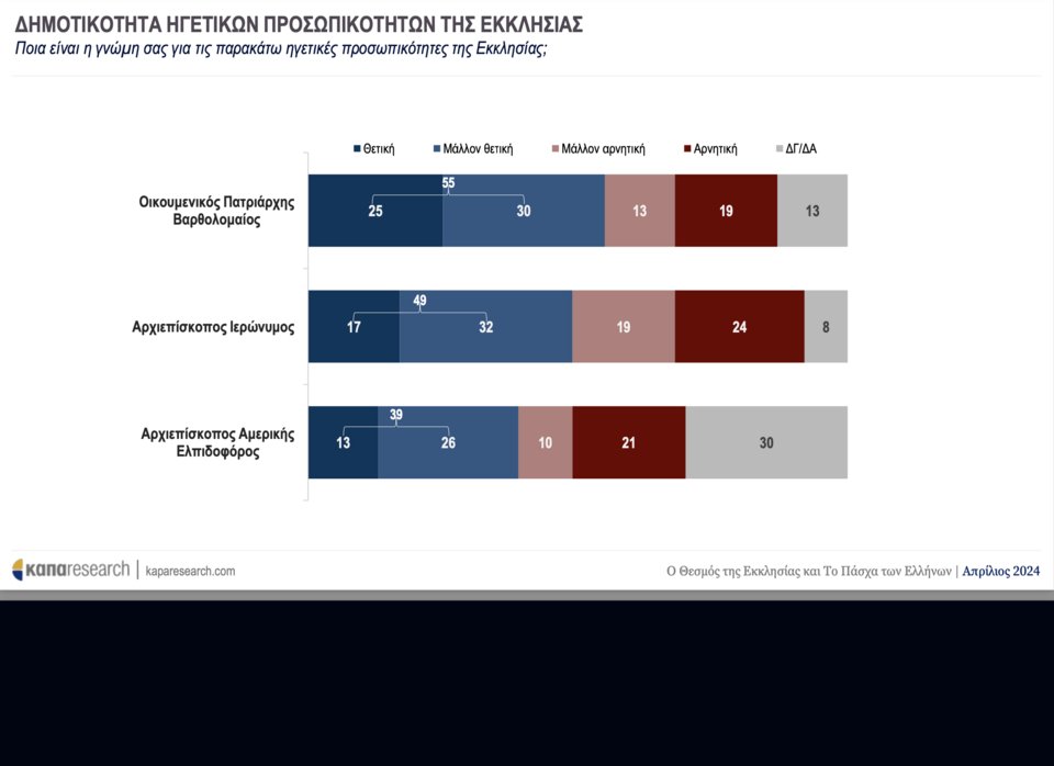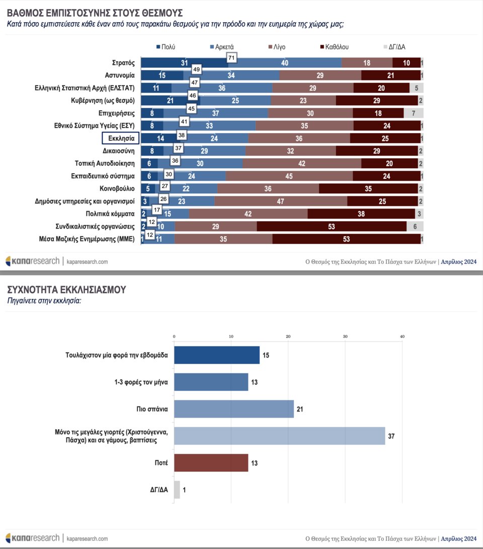 Εξαιρετικό ενδιαφέρον παρουσιάζουν τα ευρήματα της έρευνας που διενήργησε η Κάπα Research για το πώς αντιλαμβάνονται οι Έλληνες τον θεσμό της Εκκλησίας, στο πλαίσιο σειράς ερευνών αξιολόγησης των σημαντικότερων θεσμών με αφορμή τη συμπλήρωση 50 χρόνων από τη Μεταπολίτευση.