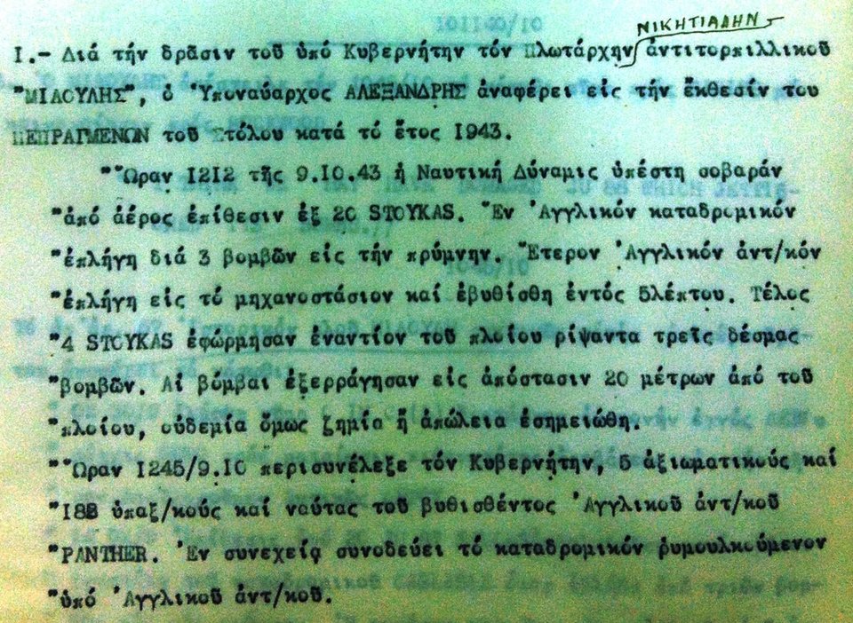 «Είχε αποστολή τον βομβαρδισμό της βρετανικής ναυτικής δύναμης η οποία έπλεε στα στενά της Καρπάθου, αποτελούμενη από το καταδρομικό H.M.S. Carlisle και τα αντιτορπιλικά H.M.S. Panther, Petard, Rockwood καθώς και το ελληνικό αντιτορπιλικό Μιαούλης», αναφέρει στο ΑΠΕ-ΜΠΕ ο Κώστας Θωκταρίδης.