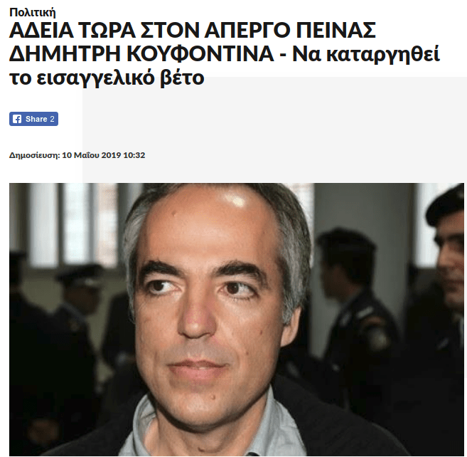 Το πρωτοσέλιδο στην ιστοσελίδα της «Αυγής» για τον Δημήτρη Κουφοντίνα: