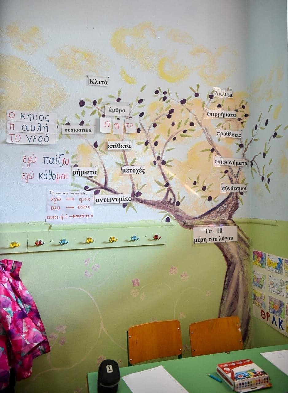 Από τις αίθουσες του 12ου Δημοτικού Σχολείου Αθηνών στο Πολύγωνο, ξεπροβάλλουν πελώριες ελιές που στα κλαδιά τους έχουν τα μέρη του λόγου, ουράνια τόξα και παιδικές φιγούρες που στέλνουν μηνύματα κατά της βίας.
