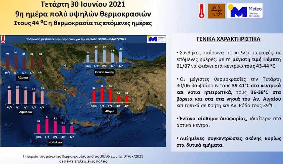 Σύμφωνα με τη νέα πρόγνωση καιρού του Εθνικού Αστεροσκοπείου Αθηνών/meteo.gr, τις επόμενες ημέρες η θερμοκρασία θα παρουσιάσει νέα, σημαντική άνοδο. Σε συνδυασμό με την επίδραση της τοπογραφίας στη δυτική ροή των ανέμων, σύμφωνα με τα διαθέσιμα προγνωστικά στοιχεία του Εθνικού Αστεροσκοπείου Αθηνών / meteo.gr, οι μέγιστες τιμές της την Πέμπτη 01/07 στα κεντρικά ηπειρωτικά θα φτάσουν τους 43-44 ⁰C.