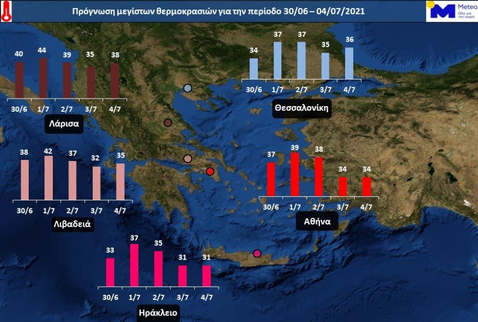Στον παρακάτω Χάρτη εμφανίζεται η πορεία της μέγιστης θερμοκρασίας από την Τετάρτη 30/06 έως και την Κυριακή 04/07, σε πέντε επιλεγμένες πόλεις της Ελλάδος, με τις μεγαλύτερες μέγιστες θερμοκρασίες τις επόμενες ημέρες να καταγράφονται στη Θεσσαλία και στη Βοιωτία: