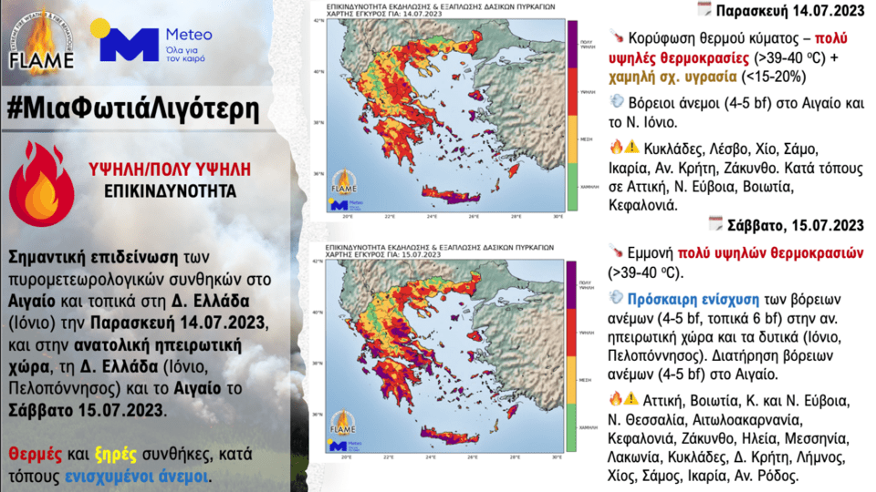 Είναι σημαντικό να τονιστεί ότι έως και το Σάββατο 15 Ιουλίου 2023, η ευφλεκτότητα των νεκρών δασικών καυσίμων αναμένεται να είναι κρίσιμα υψηλή. Όπως προκύπτει από την ανάλυση των διαθέσιμων προγνωστικών στοιχείων, η περιεχόμενη υγρασία των νεκρών δασικών καυσίμων (δείκτης ευφλεκτότητας) αναμένεται να υποχωρήσει σε τιμές κάτω του 10 % σε αρκετές περιοχές της ανατολικής ηπειρωτικής χώρας, παραμένοντας σε αυτά τα επίπεδα ακόμα και κατά τη διάρκεια των νυχτερινών ωρών. Κάτω από αυτές τις πυρομετεωρολογικές συνθήκες, η εξάπλωση της φωτιάς θα ευνοείται ακόμα και κατά τη διάρκεια της νύχτας, καθιστώντας δύσκολο το έργο της διαχείρισης και καταστολής τυχόν δασικών πυρκαγιών. Στους δύο χάρτες του γραφικού που ακολουθεί συνοψίζονται οι περιοχές με την υψηλή και πολύ υψηλή επικινδυνότητα για σήμερα, Παρασκευή 14 Ιουλίου 2023, και αύριο, Σάββατο 14 Ιουλίου 2023.