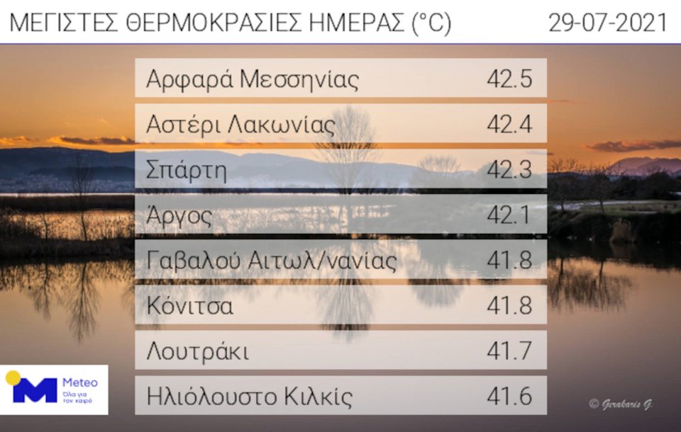 Μάλιστα, σε οκτώ περιοχές ο υδράργυρος ξεπέρασε τους 41,5 βαθμούς Κελσίου.