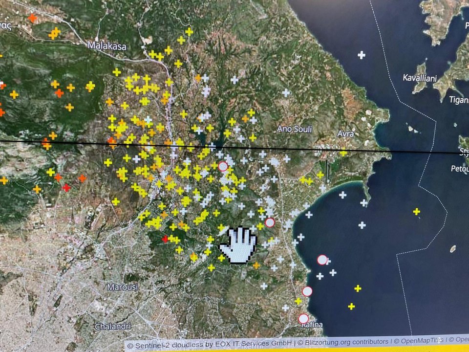 Η κεραυνική δραστηριότητα είναι ήδη έντονη και χαρακτηριστική είναι η παρακάτω εικόνα που αποτυπώνει πριν λίγο την κεραυνική δραστηριότητα στην Αττική. Με άσπρο οι κεραυνοί που έπεφταν εκείνη τη στιγμή και με κίτρινο αυτοί που είχαν πέσει λίγη ώρα πριν.