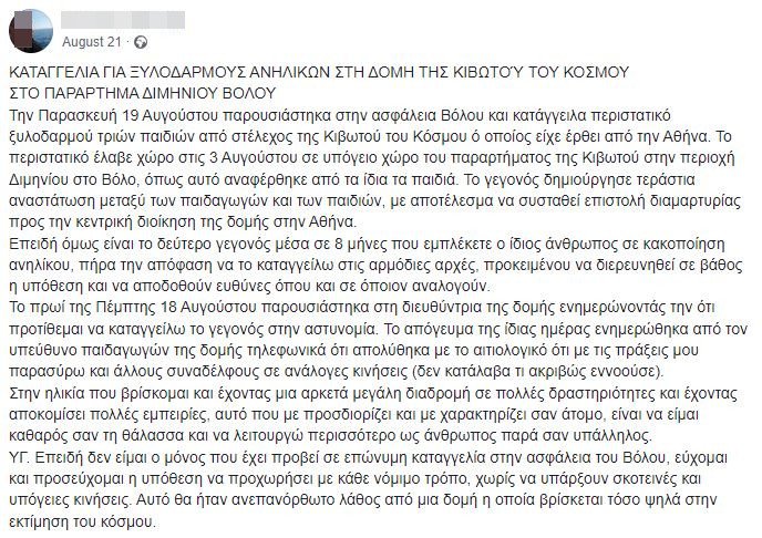 Επειδή όμως είναι το δεύτερο γεγονός μέσα σε 8 μήνες όπου εμπλέκεται ο ίδιος άνθρωπος σε κακοποίηση ανηλίκου, πήρα την απόφαση να το καταγγείλω στις αρμόδιες αρχές, προκειμένου να διερευνηθεί σε βάθος η υπόθεση και να αποδοθούν ευθύνες όπου και σε όποιον αναλογούν.