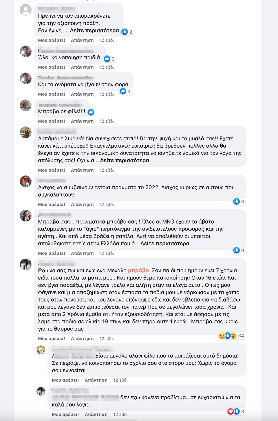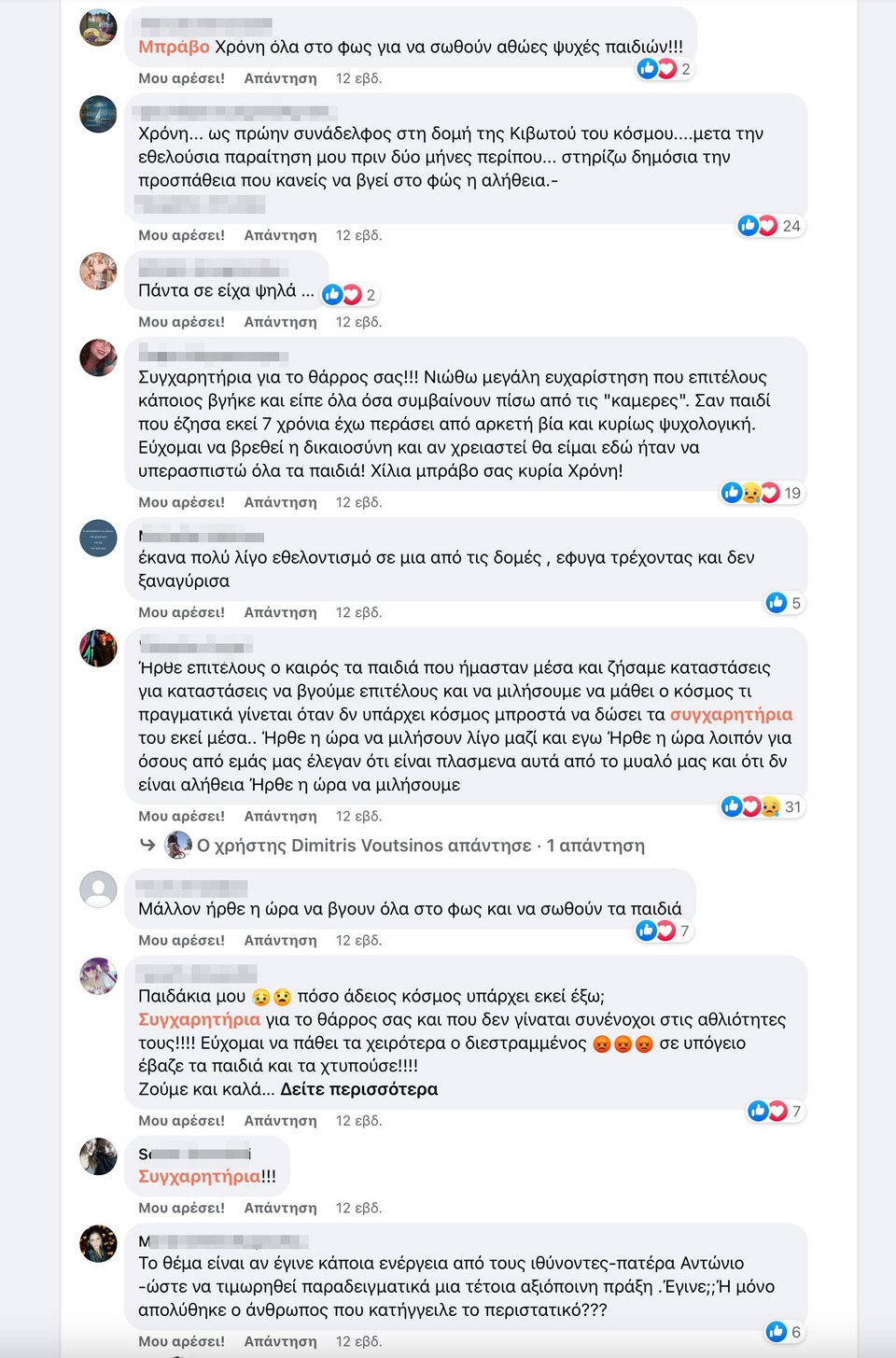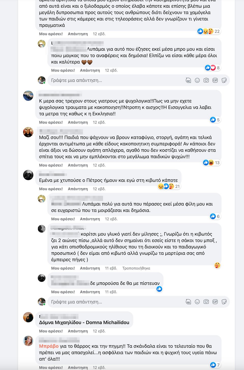 Από κάτω πολλοί χρήστες των social media έσπευσαν είτε να συγχαρούν τον καταγγέλλοντα, είτε να μοιραστούν δικές τους εμπειρίες από την Κιβωτό. Μάλιστα, ορισμένοι καταγγέλλουν και συγκεκριμένα πρόσωπα σε κάποιες δομές για ξυλοδαρμούς.