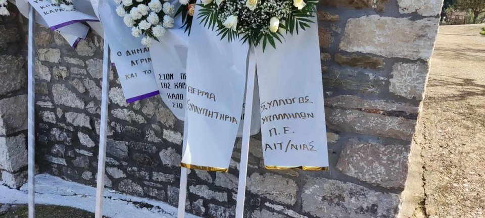 Στεφάνια έστειλαν ο υφυπουργός Εργασίας Κώστας Καραγκούνης, ο δήμαρχος Αγρινίου Γιώργος Παπαναστασίου και το Δημοτικό Συμβούλιο και ο Σύλλογος Υπαλλήλων Περιφερειακής Ενότητας Αιτωλοακαρνανίας.