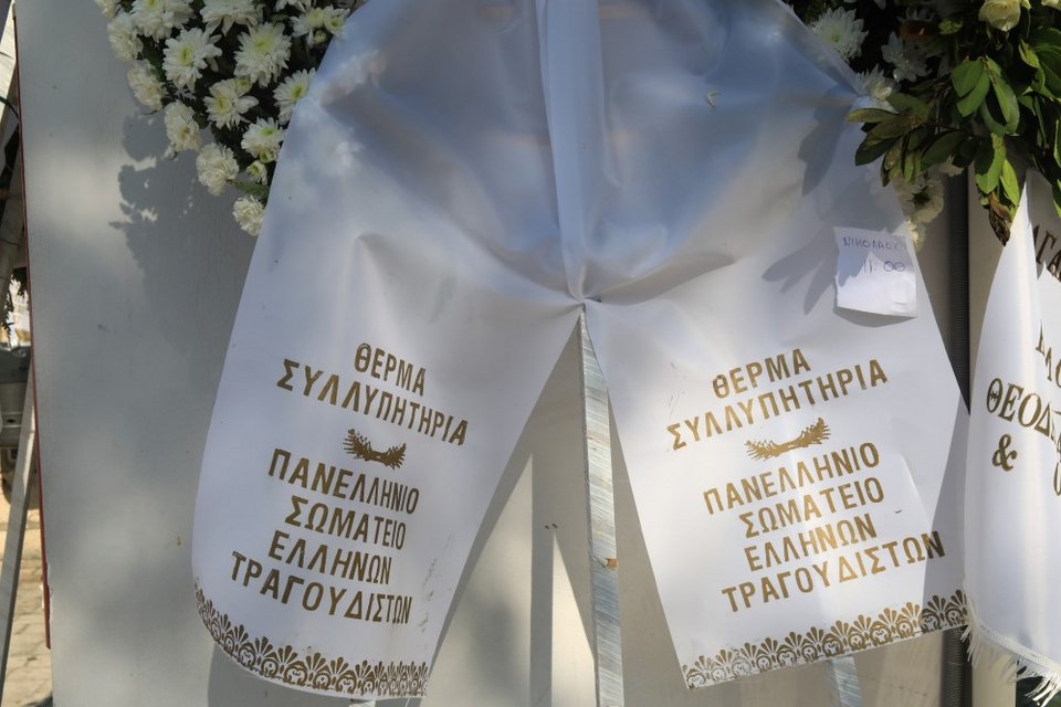 Το νεκροταφείο είχε γεμίσει στεφάνια, μεταξύ των οποίων αυτά των Γιώργου Λιάνη, Γιώργου Νταλάρα, Μανώλη Μητσιά, Χαρούλας Αλεξίου, Μάκη Δελαπόρτα.