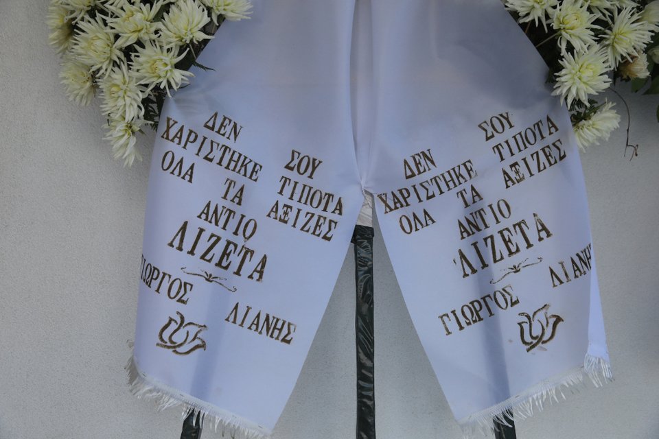 Ανάμεσα στα στεφάνια ήταν και αυτό του πρώην συζύγου της, Γιώργου Λιάνη. «Δεν σου χαρίστηκε τίποτε, όλα τα άξιζες. Αντίο Λιζέτα», ήταν το μήνυμα Γιώργου Λιάνη: