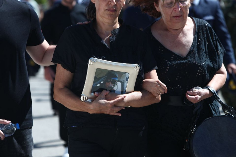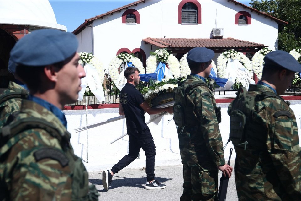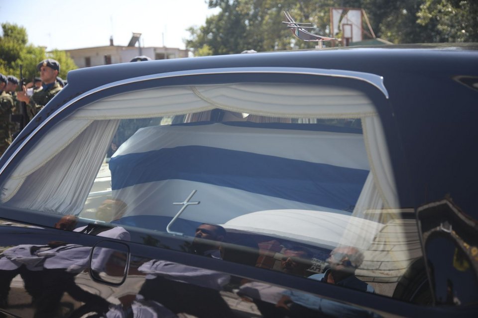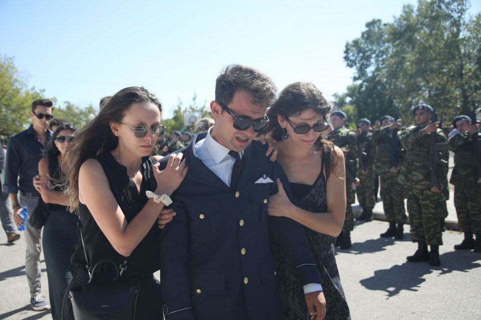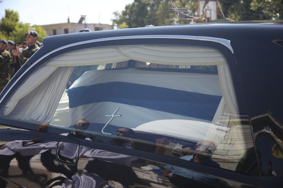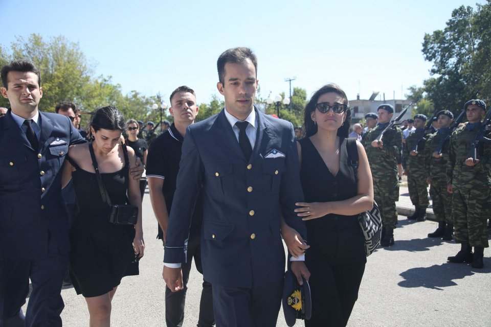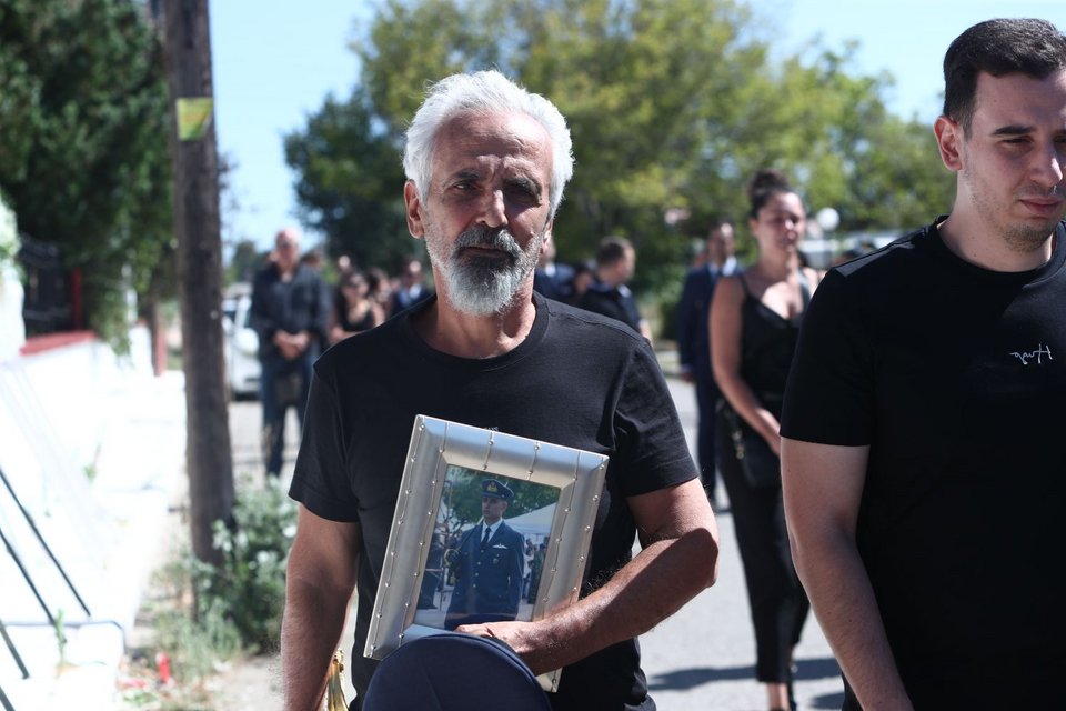 Η εξόδιος ακολουθία του πιλότου ξεκίνησε στις 5 το απόγευμα στον ιερό ναό Αγίου Γεωργίου Παλιού Αγιονερίου, παρουσία του πρωθυπουργού Κυριάκου Μητσοτάκη και του υπουργού Άμυνας Νίκου Δένδια.