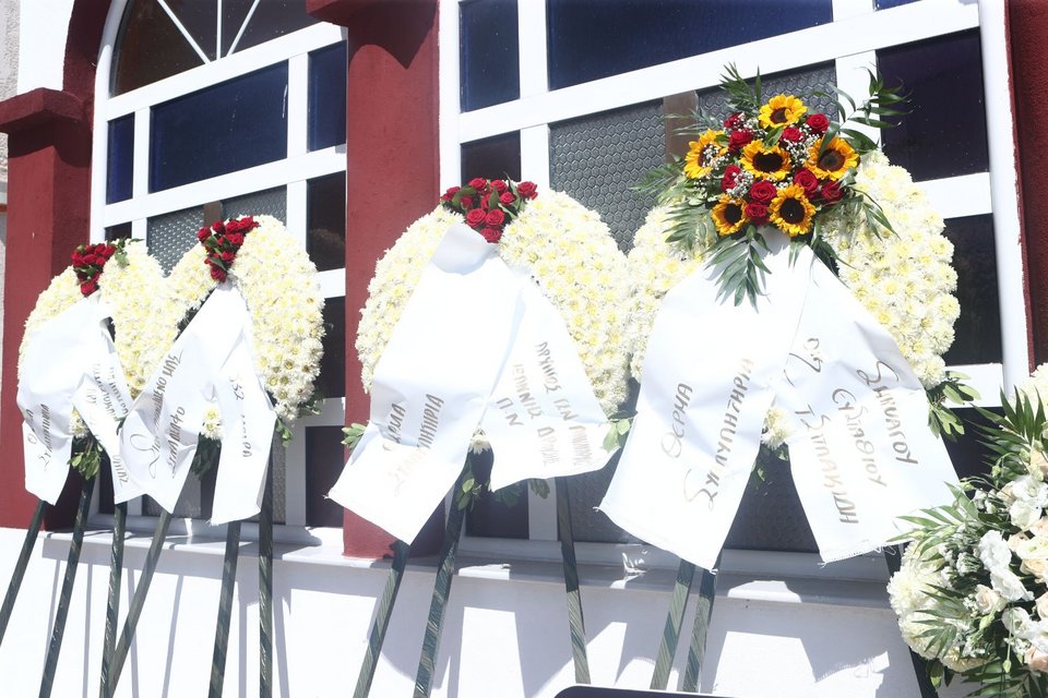 Αρκετή ώρα πριν από την κηδεία ο περιβάλλων χώρος της εκκλησίας είχε γεμίσει από στεφάνια που έστειλαν συγγενείς, φίλοι και συνάδελφοι στον άτυχο πιλότο της Πολεμικής Αεροπορίας.