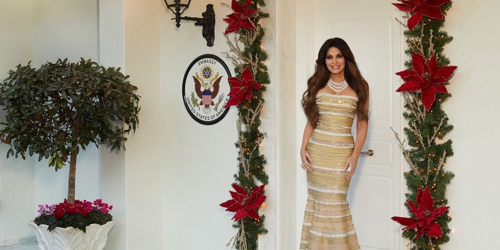 Στη φωτογραφία που συνοδεύει το μήνυμα που ανέβηκε στο X (πρώην Twitter), η πρέσβης φαίνεται να βρίσκεται στην χριστουγεννιάτικα στολισμένα είσοδο του κτιρίου της πρεσβείας, φορώντας ένα λαμπερό χρυσό, στενό και μακρύ στράπλες φόρεμα με λευκές λεπτομέρειες και ένα εντυπωσιακό κολιέ.