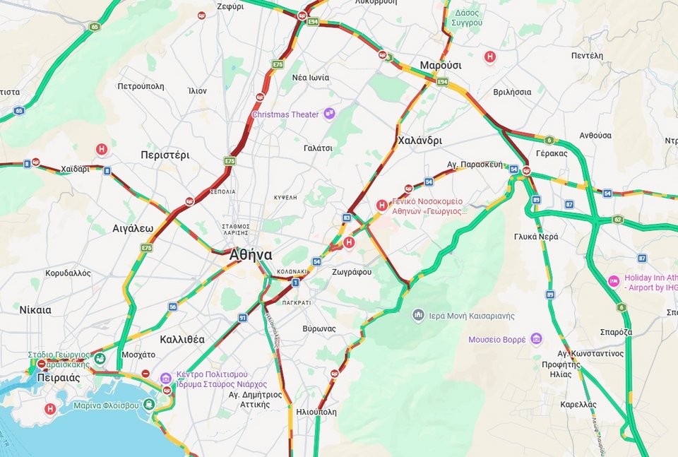 Η εικόνα μετά τις 10:00 στους δρόμους παραμένει δύσκολη. Στην άνοδο του Κηφισού η κίνηση ξεκινά από το ύψος της Κωνσταντινουπόλεως και φτάνει τη Νέα Φιλαδέλφεια. Στην κάθοδο στο κόκκινο είναι από το ύψος της Αττικής οδού μέχρι το ύψος της Ιεράς όδου.