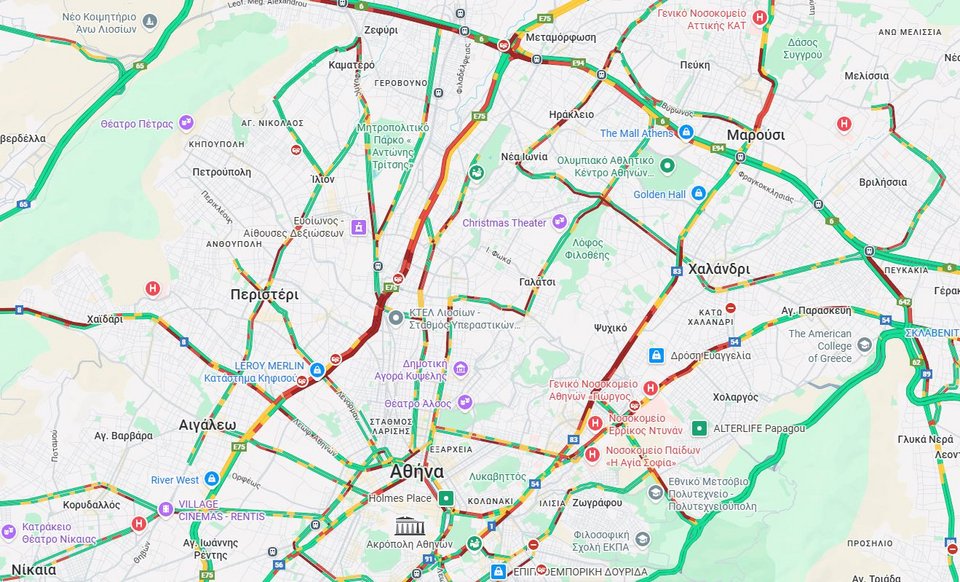 Στο «κόκκινο βρίσκεται ο Κηφισός, το πρωί της Τρίτης, από το ύψος της Μεταμόρφωσης μέχρι και το Αιγάλεω και στα δύο ρεύματα κυκλοφορίας.