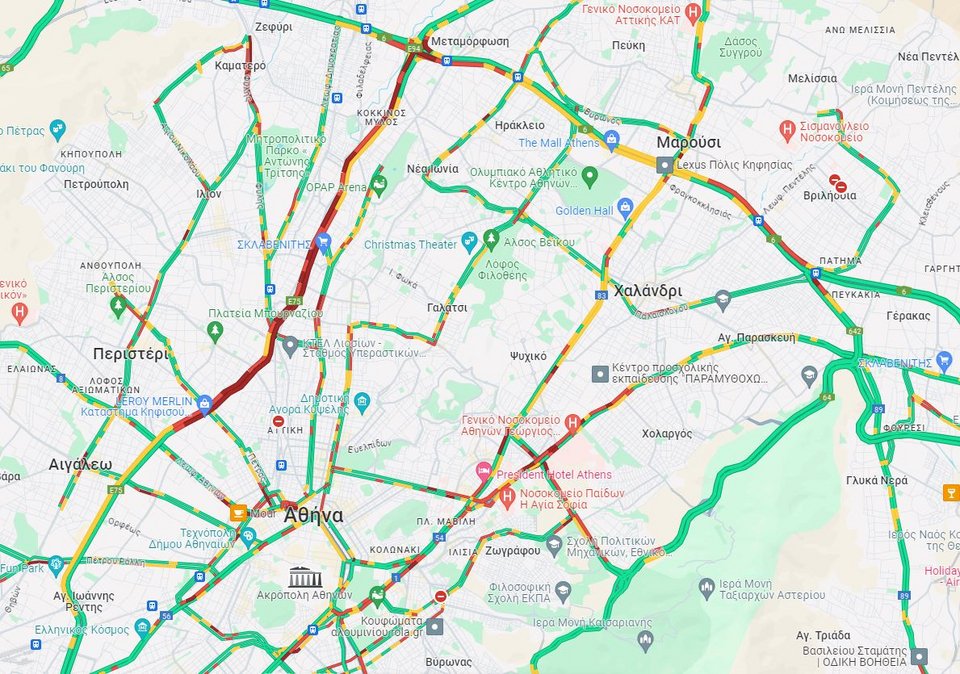Ειδικότερα, μποτιλιάρισμα σημειώνεται στην Λεωφόρο Κηφισίας, από το ύψος του Άλσους Συγγρού μέχρι και το President και στα δυο ρεύματα κυκλοφορίας.