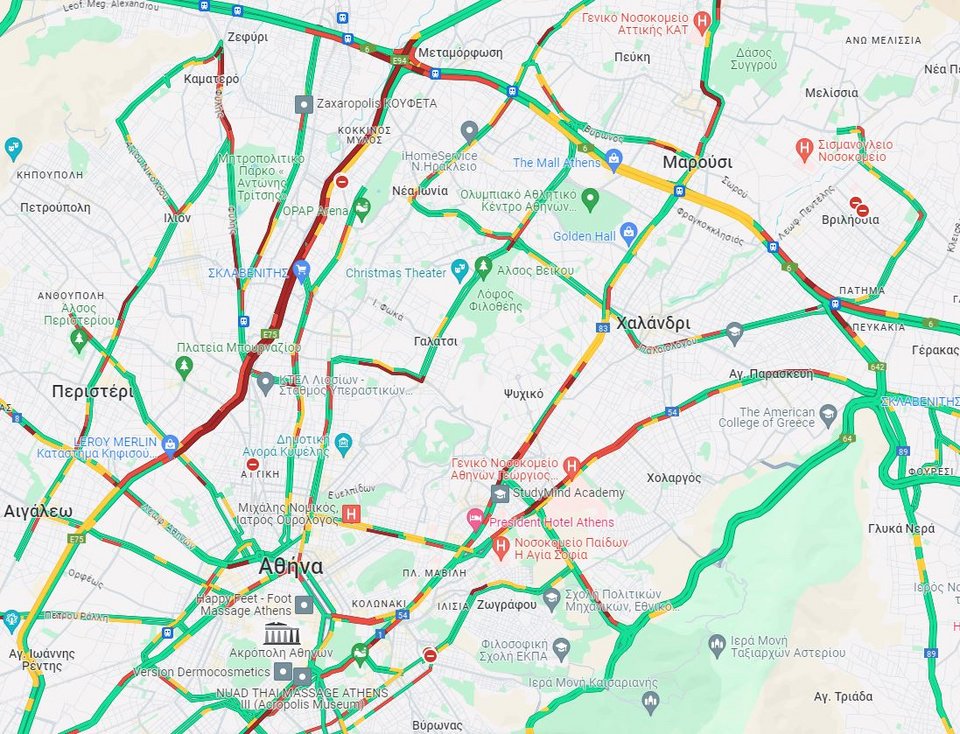 Παράλληλα, μποτιλιάρισμα σημειώνεται στην Λεωφόρο Κηφισίας, από το ύψος του Άλσους Συγγρού μέχρι το Δαχτυλίδι και από το ύψος του Χαλανδρίου μέχρι και το President και στα δυο ρεύματα κυκλοφορίας.