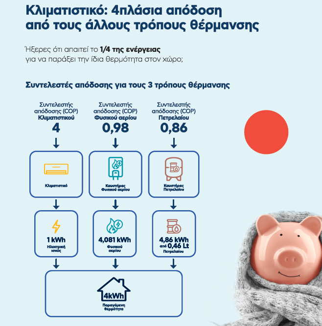 Το κλιματιστικό αποτελεί την οικονομικότερη λύση θέρμανσης. Υπερέχει του πετρελαίου, αλλά και του φυσικού αερίου, όντας σαφώς αποδοτικότερο σχεδόν κατά τέσσερις φορές. Και τούτο, διότι η απόδοση (COP) του κλιματιστικού, δηλαδή η ενέργεια που επιστρέφει ως θερμότητα για κάθε Kw που καταναλώνεται, στηρίζεται στην απορρόφηση θερμότητας από το περιβάλλον ώστε να θερμάνει τον χώρο μας.