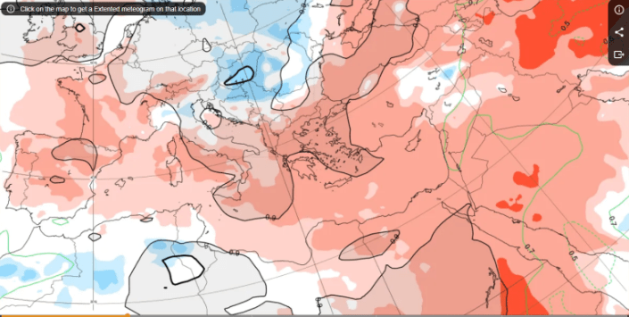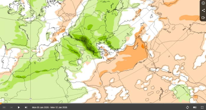 Κατά την εβδομάδα από 5 έως 12 Ιανουαρίου, η Ελλάδα τοποθετείται ξεκάθαρα στη ζώνη των θετικών θερμοκρασιακών αποκλίσεων. Οι θερμοκρασίες αναμένεται να κινούνται πάνω από τις κλιματικές τιμές της εποχής, κυρίως στα ανατολικά τμήματα της χώρας, καθώς και στο Αιγαίο και την Κρήτη. Η επικράτηση νοτιοδυτικών ροών στην Ανατολική Μεσόγειο ευνοεί τη μεταφορά ηπιότερων αερίων μαζών, χωρίς ενδείξεις οργανωμένης ψυχρής εισβολής.