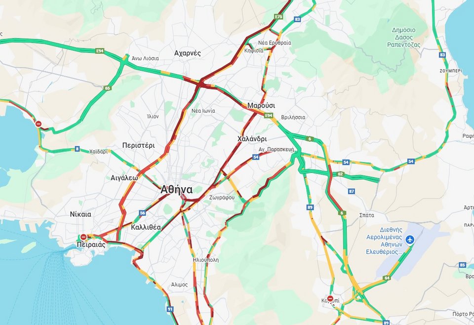 Αυτή την ώρα κυκλοφοριακή συμφόρηση επικρατεί στην κάθοδο του Κηφισού, στα δύο ρεύματα της Κηφισίας και στη Μεσογείων.