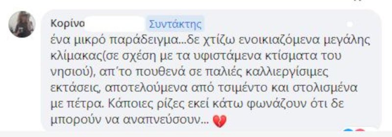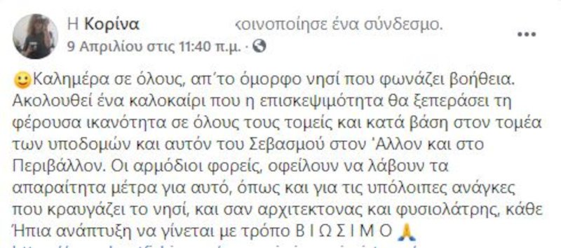 Επιπλέον, μόλις πριν από λίγες ημέρες, στην τελευταία της ανάρτηση σε μέσο κοινωνικής δικτύωσης, σύμφωνα με το flashnews, μετέφερε την αγωνία της για το μέλλον του ακριτικού νησιού. «Καλημέρα σε όλους, από το όμορφο νησί που φωνάζει βοήθεια. Ακολουθεί ένα καλοκαίρι που η επισκεψιμότητα θα ξεπεράσει τη φέρουσα ικανότητα σε όλους τους τομείς και κατά βάση στον τομέα των υποδομών και αυτόν του Σεβασμού στον Άλλον και στο Περιβάλλον. Οι αρμόδιοι φορείς οφείλουν να λάβουν τα απαραίτητα μέτρα για αυτό, όπως και για τις υπόλοιπες ανάγκες που κραυγάζει το νησί, και σαν αρχιτέκτονας και φυσιολάτρης, κάθε ήπια ανάπτυξη να γίνεται με τρόπο Β Ι Ω Σ Ι Μ Ο», είχε δημοσιεύσει.