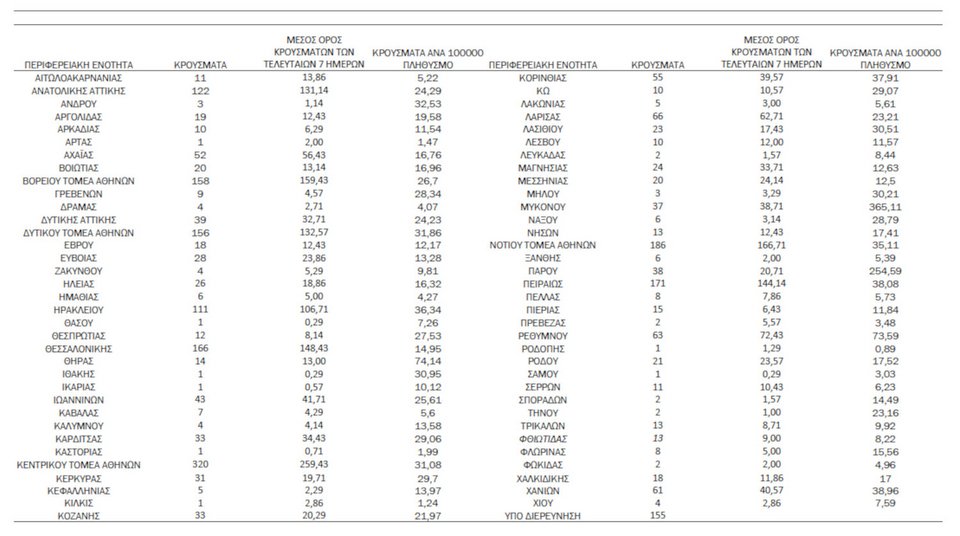 Η κατανομή των 2.545 νέων εγχώριων κρουσμάτων ανά Περιφερειακή Ενότητα παρουσιάζεται στον παρακάτω πίνακα: