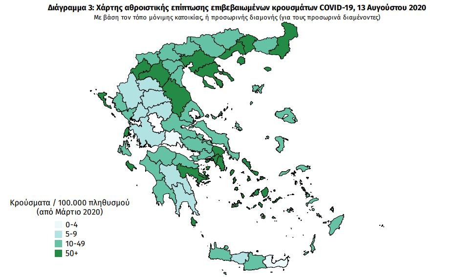 Λίγο αργότερα, ο ΕΟΔΥ έδωσε την γεωγραφική κατανομή των κρουσμάτων κορωνοϊού, που καταγράφτηκαν την Πέμπτη 13/08/2020. Αναλυτικότερα, 12 κρούσματα κατά τους ελέγχους που διενεργήθηκαν στις πύλες εισόδου της χώρας, ενώ 11 ακόμη εισαγόμενα κρούσματα που προσήλθαν αυτοβούλως για έλεγχο. Από τα εγχώρια κρούσματα, τα περιστατικά που διαγνώστηκαν θετικά στον ιό κατανέμονται ως εξης: