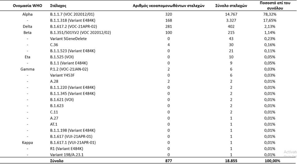 Μεταξύ των 18.908 τυχαία επιλεγμένων δειγμάτων στην επικράτεια, οι τέσσερις πιο συχνές μεταλλάξεις ειδικού ενδιαφέροντος ή υπό παρακολούθηση που έχουν απομονωθεί είναι της Άλφα σε ποσοστό 76,29%, και ακολουθεί το στέλεχος B.1.1.318 (Variant E484K) σε ποσοστό 11,20%. Ως σήμερα, τα κρούσματα της μετάλλαξης Δέλτα αντιπροσωπεύουν ποσοστό μόλις 0,80%, ενώ της Βήτα 0,50%.