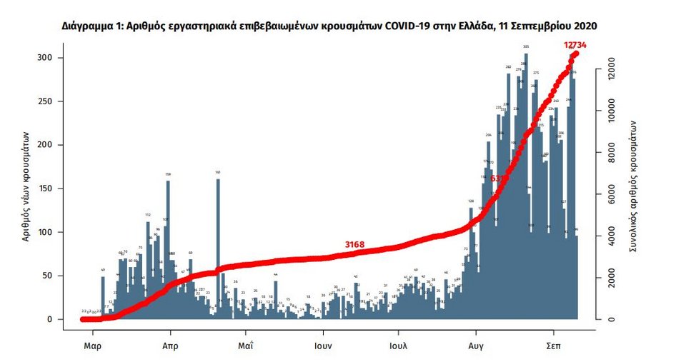 Σήμερα, 11 Σεπτεμβρίου, δηλώθηκαν 287 επιπλέον κρούσματα, εκ των οποίων 43 συνδέονται με γνωστές συρροές. 15 κρούσματα βεβαιώθηκαν κατά τους ελέγχους που διενεργήθηκαν στις πύλες εισόδου της χώρας.