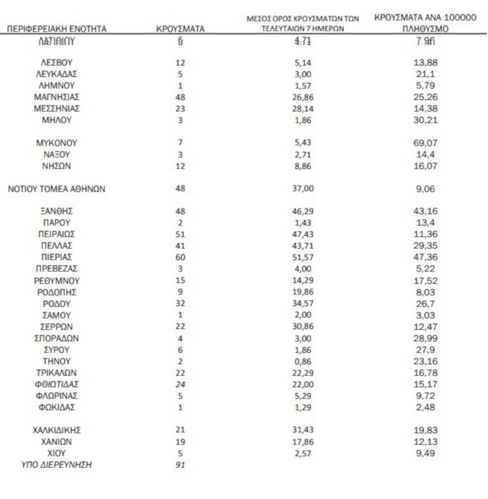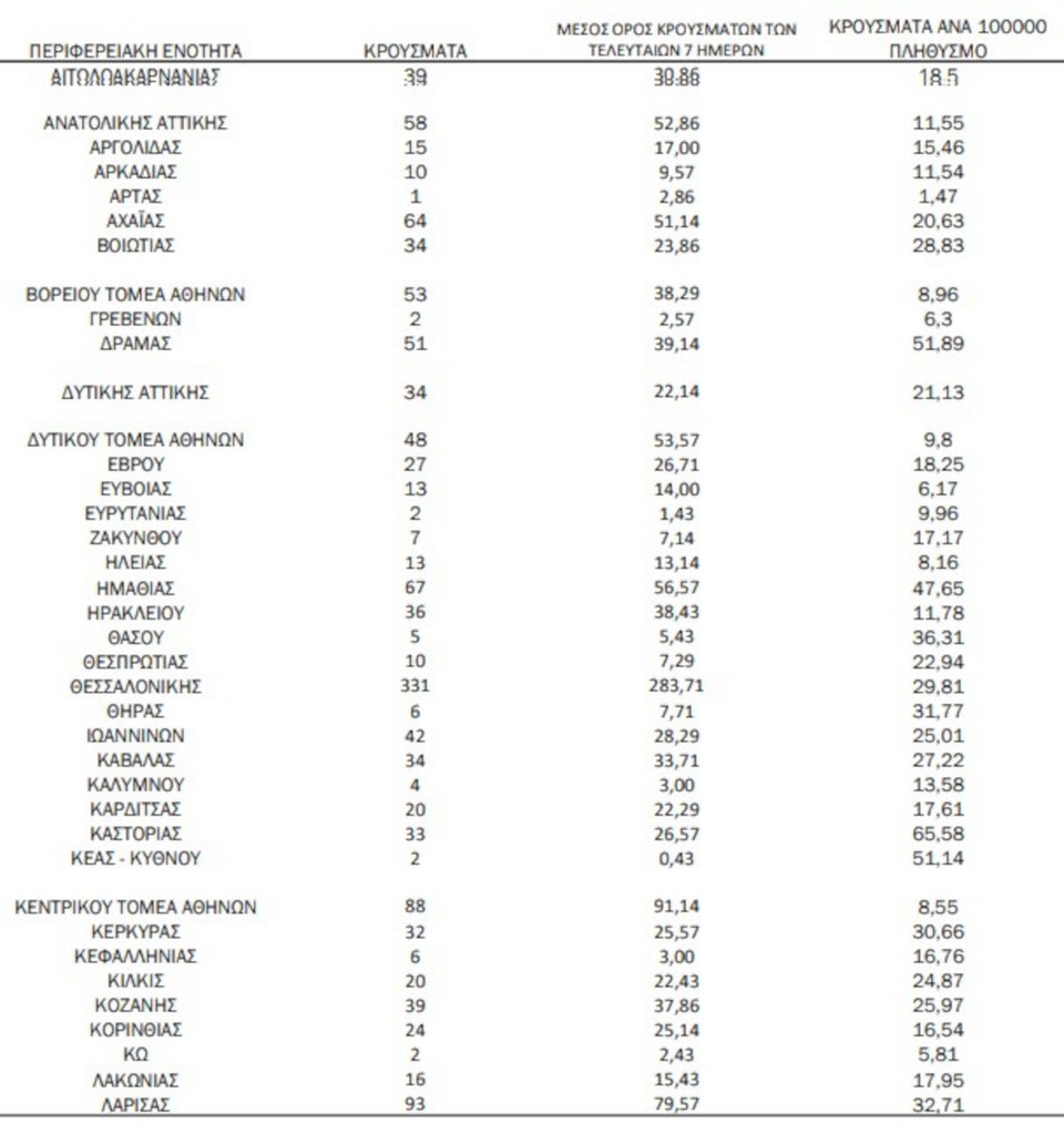 Την ίδια ώρα, 93 κρούσματα καταγράφοντα στη Λάρισα, 67 στη Ημαθία, 64 στη Αχαΐα και 60 στην Πιερία.