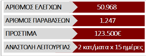 Από τους συνολικά 50.968 ελέγχους κατεγράφησαν 1.247 περιπτώσεις παράβασης των μέτρων επιδημιολογικού συναγερμού και επιβλήθηκαν πρόστιμα ύψους 123.500€ και κύρωση αναστολής λειτουργίας 15 ημερών σε δύο (2) επιχειρήσεις.
