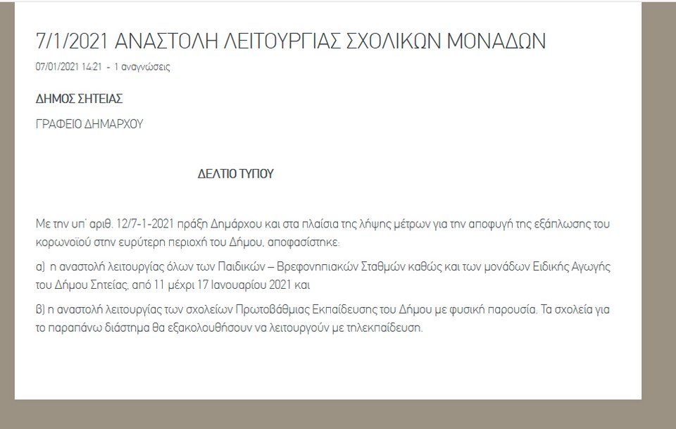 Κλειστά θα παραμείνουν τα σχολεία στη Σητεία εξαιτίας της έξαρσης του κορωνοϊού στην περιοχή.