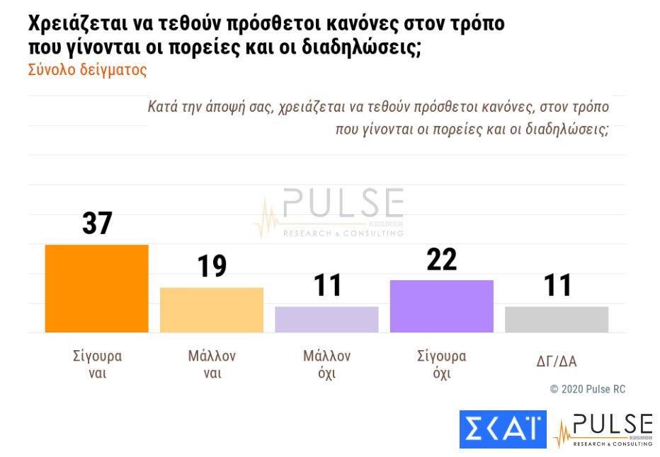 Για το νομοσχέδιο, περισσότεροι από τους μισούς (56%) απάντησε πως βλέπει με καλό μάτι την θέσπιση πρόσθετων κανόνων για τις διαδηλώσεις, θεωρώντας πως «σίγουρα» ή «μάλλον» πρέπει να μπουν επιπλέον κανόνες. Αντίθετα, το 33% εκτιμά πως δεν χρειάζονται αλλαγές.
