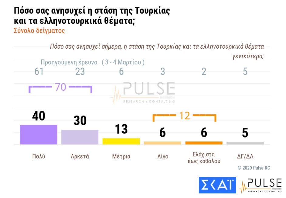 Οσον αφορά τα Ελληνοτουρκικά, στην ερώτηση για το πόσο ανησυχούν για την στάση της Τουρκίας το τελευταίο διάστημα, οι 7 στους 10 απάντησαν πως ανησυχούν «πολύ» ή «αρκετά». Πολύ μικρότερο είναι το ποσοστό αυτών που ανησυχούν από ελάχιστα έως καθόλου, καθώς αυτό φτάνει το 12%.