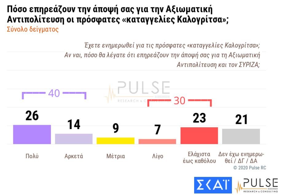 Ενα άλλο θέμα που τέθηκε στους ερωτηθέντες, είναι οι πρόσφατες αποκαλύψεις από την καταγγελία του Χ. Καλογρίτσα κατά του Χ. Παππά. Στην ερώτηση κατά το πόσο επηρεάζει αυτή η υπόθεση την άποψή τους για τον ΣΥΡΙΖΑ, το 40% απαντά πως επηρεάζει «πολύ» ή «αρκετά» την γνώμη τους για την αξιωματική αντιπολίτευση, ενώ το 30% απάντησε από «ελάχιστα» ως «καθόλου». Μεγάλο είναι ωστόσο και το ποσοστό των αναποφάσιστων γύρω από το θέμα (21%).