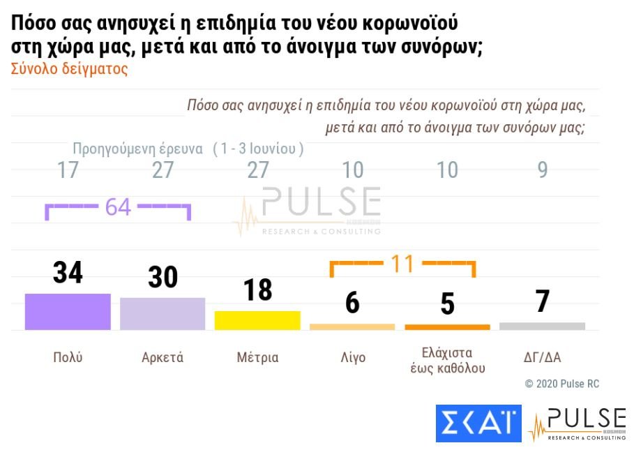 Την ανησυχία των πολιτών για την επιδημία του κορωνοϊού στη χώρα μετά και το άνοιγμα των συνόρων καταγράφει η νέα δημοσκόπηση της Pulse για λογαριασμό του ΣΚΑΪ.