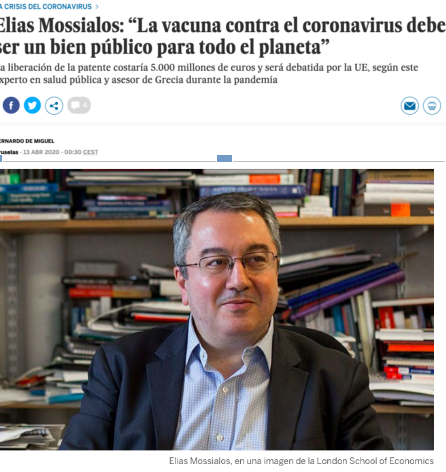 Η συνέντευξη στην El País κλείνει με τον κύριο Μόσιαλο να ανοίγει άλλο ένα θέμα ‘ Το εμβόλιο πρέπει να είναι δημόσιο αγαθό, επειδή θέλουμε να σώσουμε τον πλανήτη, και όχι μόνο τους κατοίκους μίας συγκεκριμένης χώρας. Ο ιός είναι παγκόσμιος, επομένως χρειαζόμαστε μια παγκόσμια απάντηση, όχι να τον αντιμετωπίζουμε σαν μια επιδημία που επηρεάζει μια συγκεκριμένη χώρα. Και αυτό συνεπάγεται επίσης σημαντικές ηθικές πτυχές όσον αφορά την ισότιμη κατανομή επιστημονικών ανακαλύψεων.’