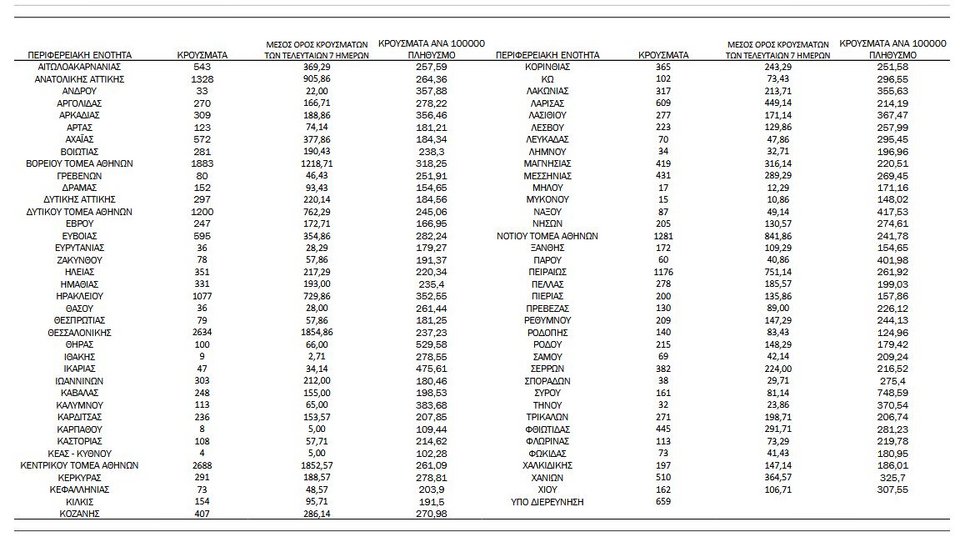 Ακολουθεί η κατανομή των 27.468 νέων εγχώριων κρουσμάτων ανά Περιφερειακή Ενότητα στον παρακάτω πίνακα: