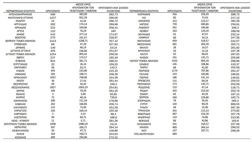 Ακολουθεί ο πίνακας με την κατανομή των 28.897 νέων εγχώριων κρουσμάτων ανά Περιφερειακή Ενότητα στον ακόλουθο πίνακα: