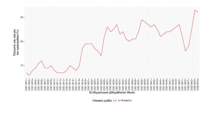 Την εβδομάδα αναφοράς, το σύνολο των ασθενών ηλικίας 4-18 ετών είναι 40.843, αποτελώντας το 32% (-3% από την προηγούμενη εβδομάδα) στο σύνολο των κρουσμάτων.