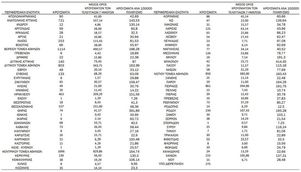Από το σύνολο των 10.562 νέων κρουσμάτων του νέου ιού στη χώρα 8 είναι εισαγόμενα. Η κατανομή των 10.554 νέων εγχώριων κρουσμάτων ανά Περιφερειακή Ενότητα παρουσιάζεται στον κατωτέρω πίνακα:
